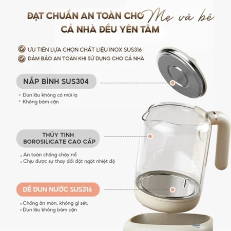 1. Chất liệu an toàn đạt chuẩn – Nắp bình thép không gỉ SUS304 đun lâu không bám mùi lạ, không bám cặn – Thân bình thuỷ tinh Borosilicata cao cấp, an toàn chống cháy nổ, chịu nhiệt tốt – Đế đun bằng thép không ghỉ SUS316 chống ăn mòn, không gỉ sét, không bám cặn