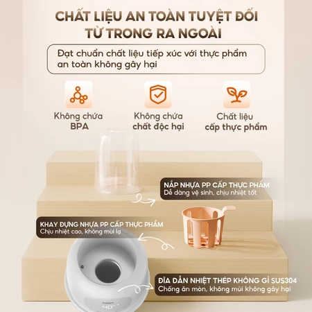 1. Chất liệu an toàn tuyệt đối từ trong ra ngoài, không chứa BPA. Nắp và khay đựng nhựa PP đạt cấp thực phẩm, dễ vệ sinh, chịu nhiệt tốt. Đĩa dẫn nhiệt bằng thép không gỉ SUS304 chống ăn món, không mùi không gây hại