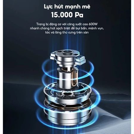 2. Lực hút mạnh mẽ 15.000Pa dễ dàng hút sạch bụi bẩn li ti và các hạt bụi lớn
