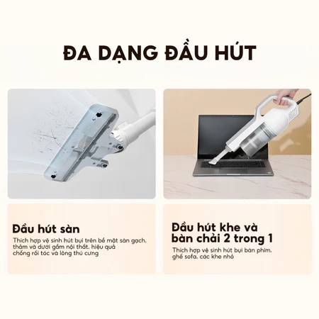 4. Thiết kế 2 trong 1 với dạng hút bụi sàn nhà và hút bụi cầm tay (dùng đầu hút khe để hút các khe, rãnh nhỏ)