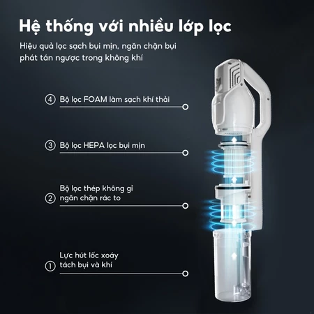 6. Hệ thống với nhiều lớp lọc gồm bộ lọc FOAM làm sạch khí thải, bộ lọc HEPA lọc bụi mịn, bộ lọc thép ngăn chặn rác to đảm bảo việc không tái nhiễm ra môi trường ngoài. Bộ lọc có thể dễ dàng vệ sinh trực tiếp với nước và tái sử dụng