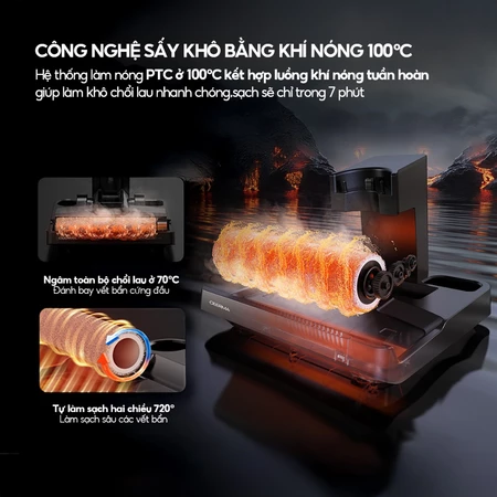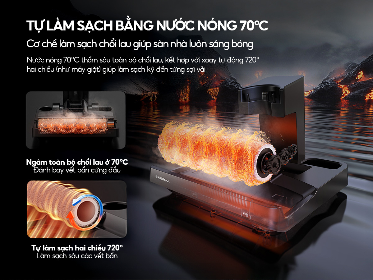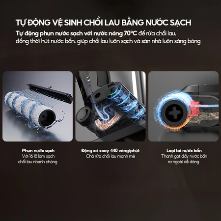 – Tự động làm sạch chổi lau bằng nước nóng 70°C: Không cần phải vệ sinh giống chổi hay cây lau nhà truyền thống, với chỉ một nhấn nút, chổi lau sẽ được làm sạch tự động với nước sạch, sẵn sàng cho các đợt dọn dẹp tiếp theo.