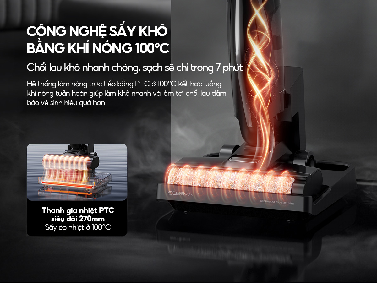 – Sấy khô chổi lau nhanh chóng: Hệ thống làm nóng trực tiếp bằng PTC ở 100°C kết hợp luồng khí nóng tuần hoàn giúp làm khô nhanh và làm tơi chổi lau đảm bảo vệ sinh hiệu quả và diệt khuẩn tối đa.