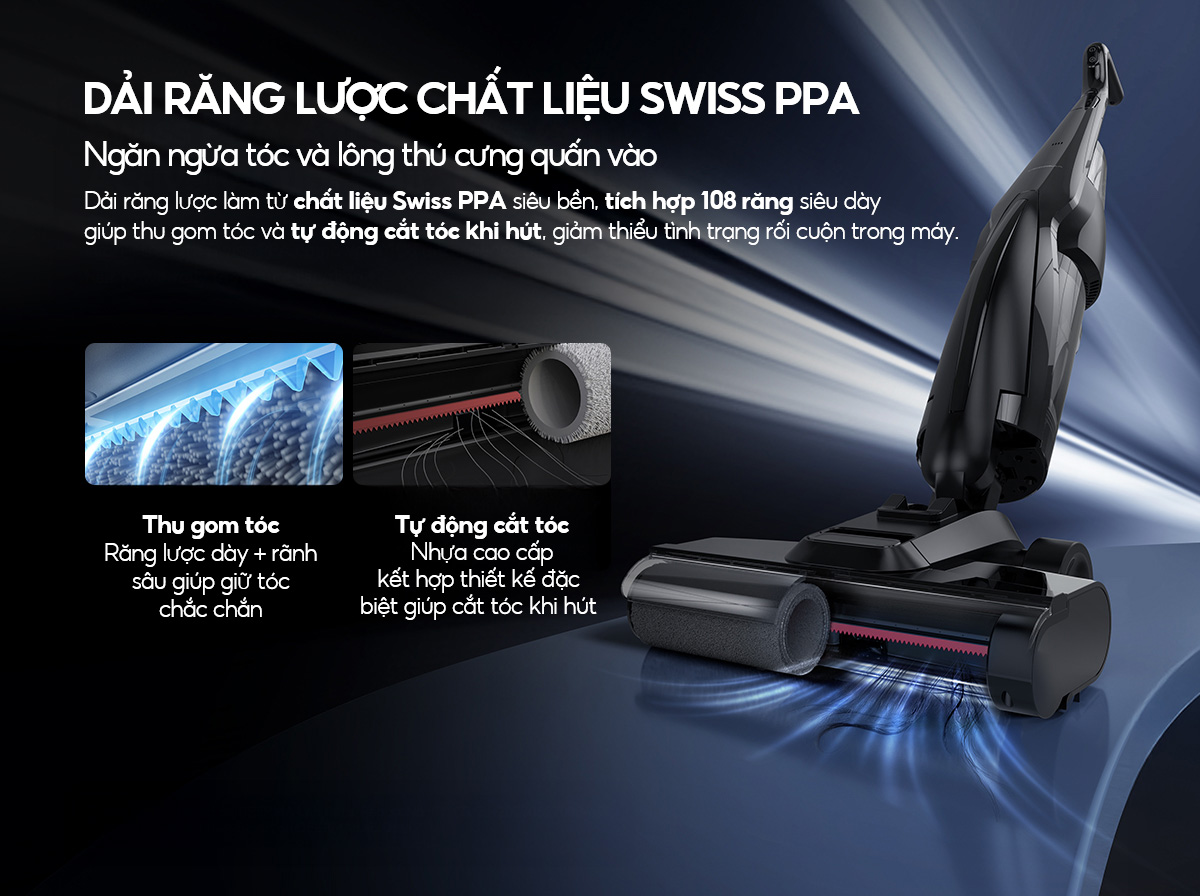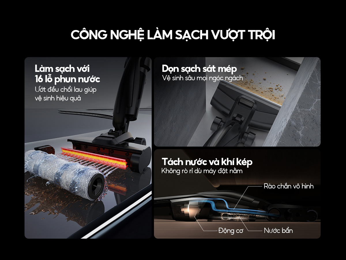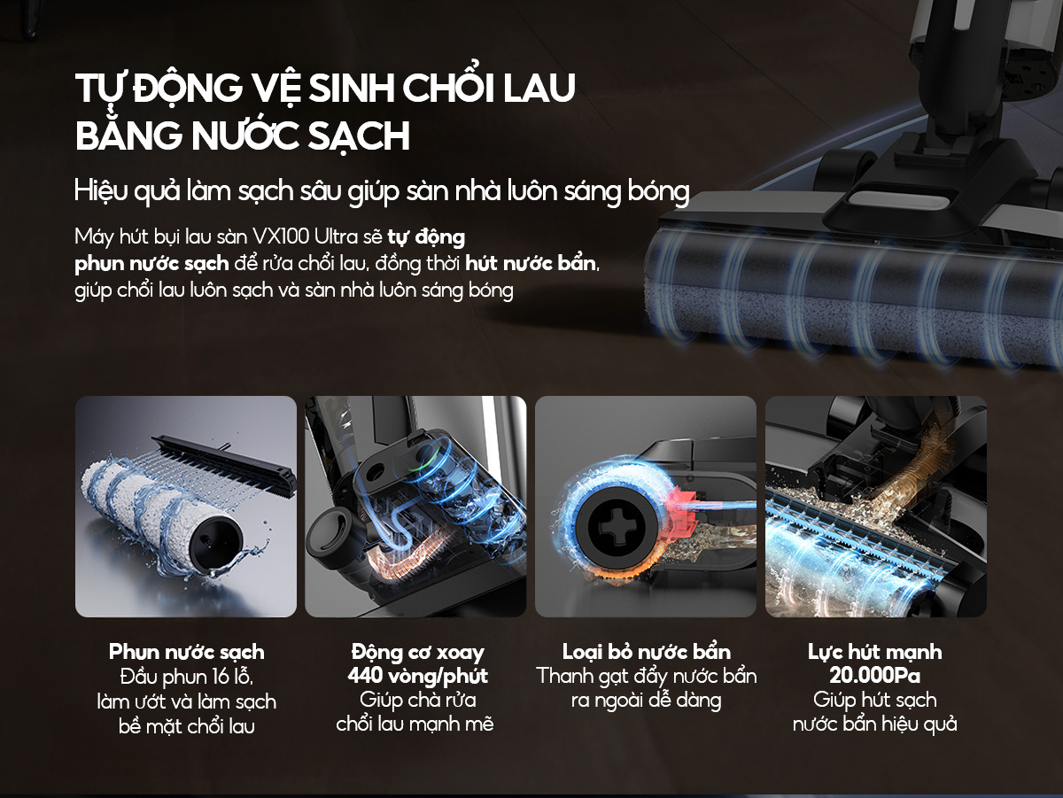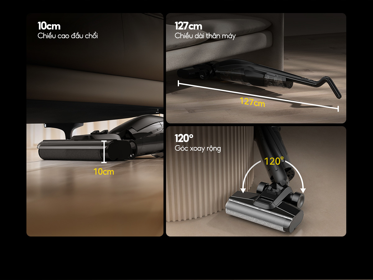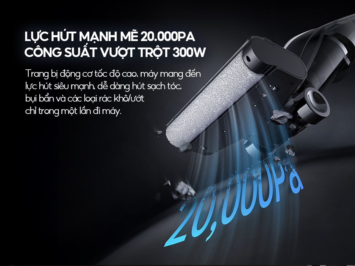 – Hút sạch thần tốc các vết bẩn khô và ướt: Tích hợp công nghệ dọn dẹp 2in1 giúp sàn nhà luôn sáng bóng mà không cần đến công cụ lau nhà truyền thống với chỉ 1-2 lần lướt.