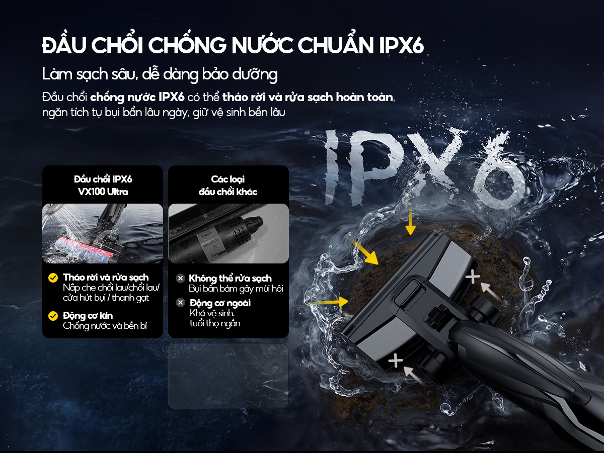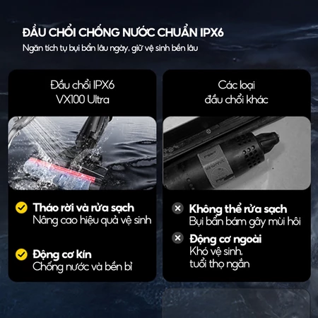 ️- Đầu chổi lau chống nước: Công nghệ chống nước IPX6 giúp chống nước và có thể tháo rời giúp vệ sinh dễ dàng và nhanh chóng, mang lại hiệu quả vệ sinh vượt trội.