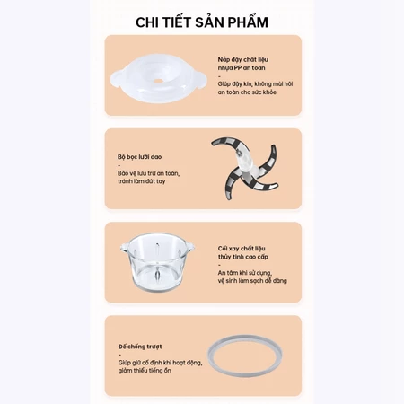 1. Xay nhuyễn nhanh: Công suất 240W giúp cối xay thủy tinh dễ dàng quan sát độ nhuyễn của nguyện liệu, hiệu quả xay nhuyễn nhanh với đa dạng nguyên liệu như xay thịt cua, cá, các loại rau củ quả,…