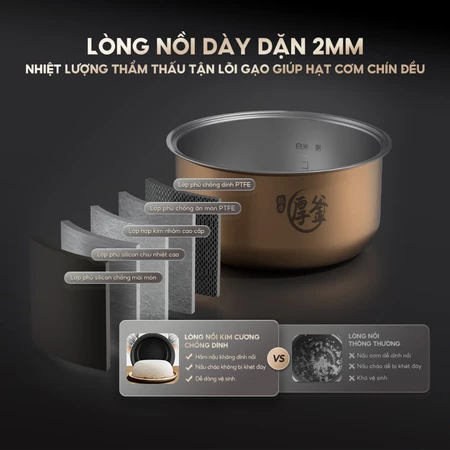 5. Nồi cơm điện tử có 5 lớp phủ siêu bền đạt tiêu chuẩn cấp thực phẩm quốc gia, sử dụng lâu dài không lo bong tróc (phủ chống dính PTFE, phủ chống ăn mòn PTFE, phủ hợp kim nhôm, phủ silicon chịu nhiệt cao, phủ silicon chống mài mòn)