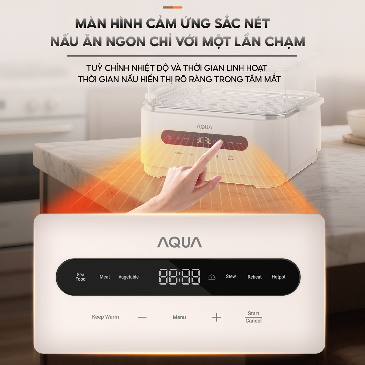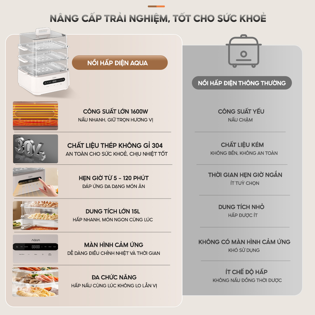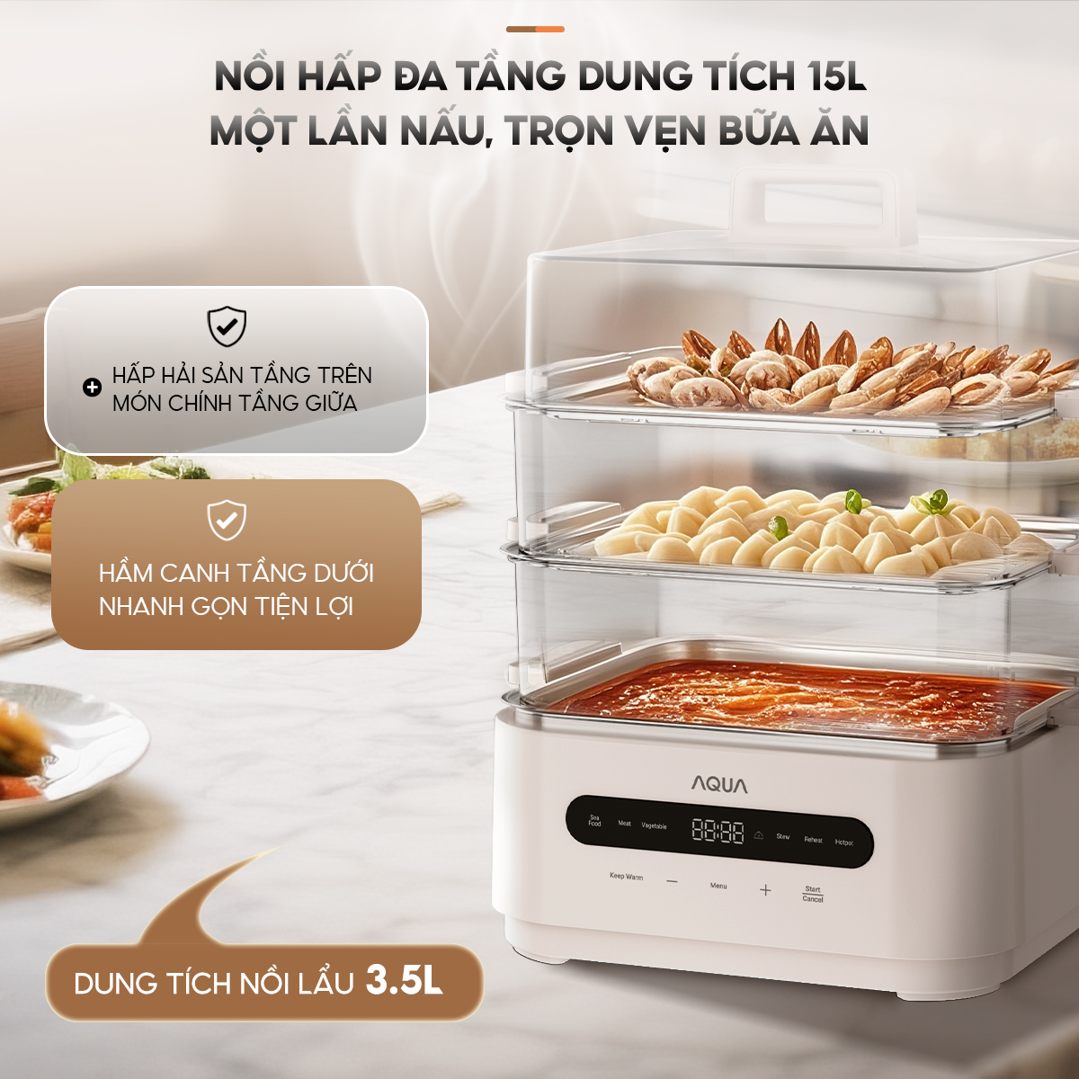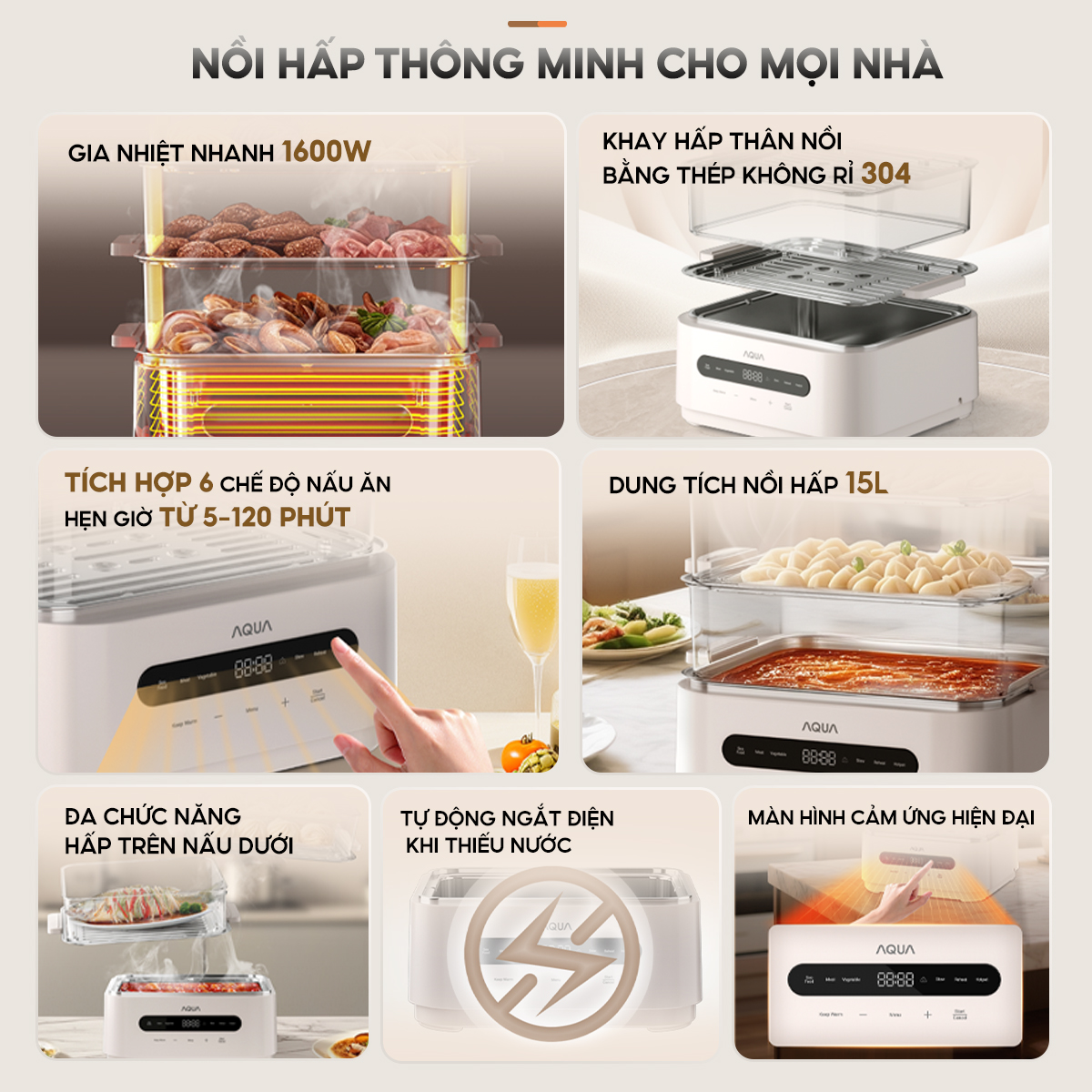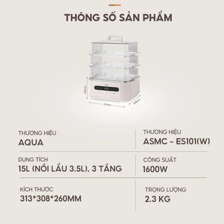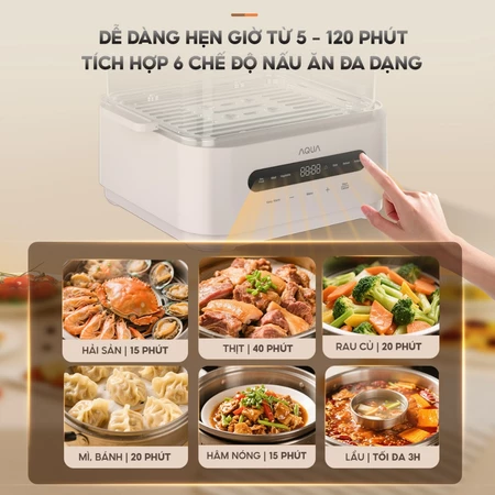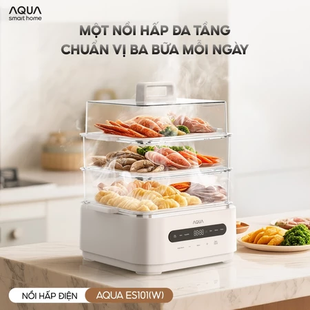 Nồi lẩu hấp đa năng AQUA ES101 15L, nồi 3 tầng, điều khiển cảm ứng, hẹn giờ 120 phút, 6 chế độ