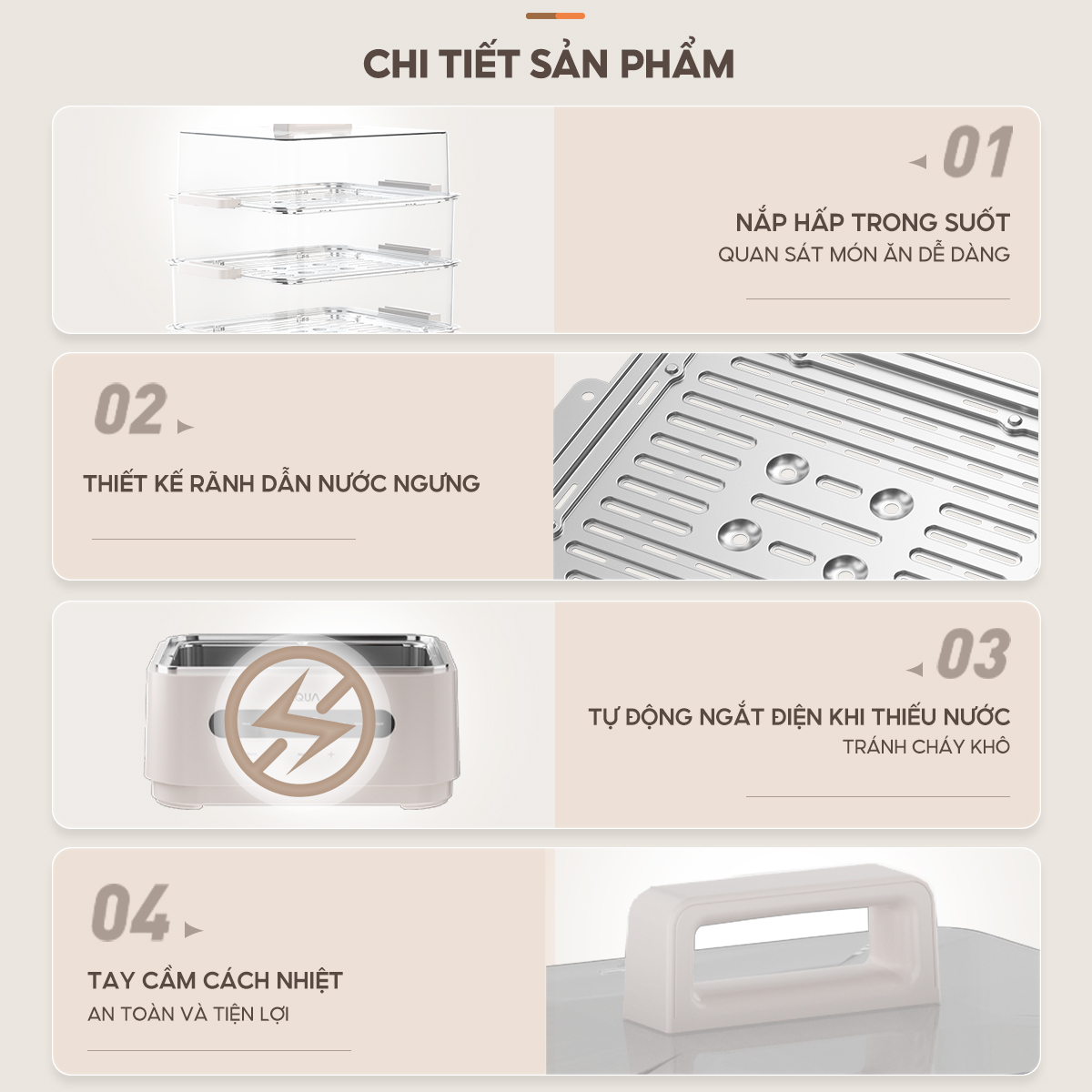 . Cơ chế an toàn, nồi lẩu hấp tự ngắt điện khi thiếu nước giúp chống cháy khô nồi